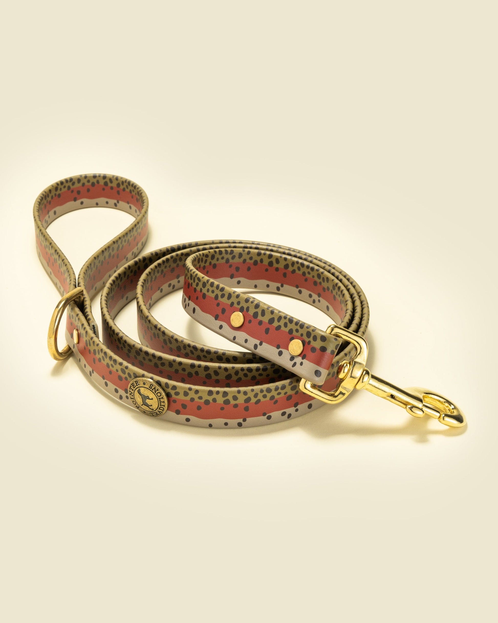 No more smelly, muddy, or cheap dog leashes! Made from thick 1" PVC coated webbing, and printed with our own Rainbow Trout pattern, these durable and weatherproof sporting dog leashes resist odors, do not soak up water, and are very easy to maintain.